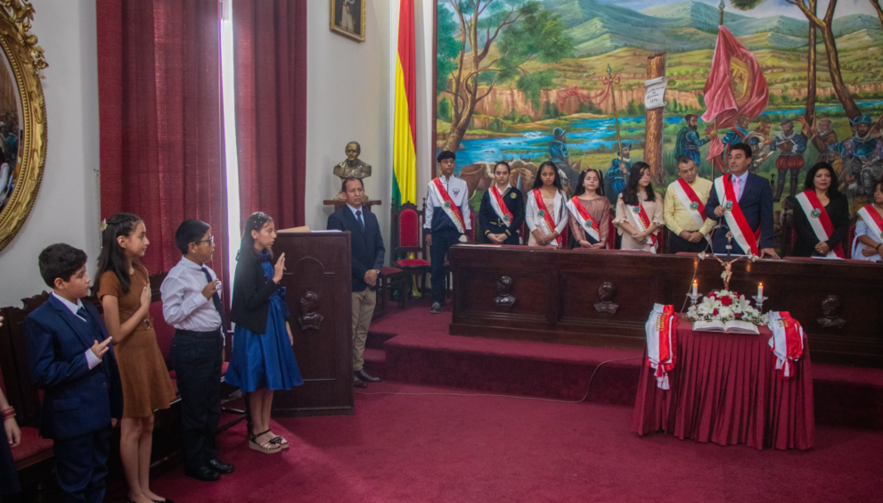 En acto protocolar realizado en el salón Consistorial de los espejos del Gobierno Autónomo Municipal de Tarija (GAMT), se realizó el acto de posesión del alcalde y concejales infantil para la gestión 2024-2025. La posesión fue realizada por el Alcalde Johnny Torres Terzo, quien pidió a los funcionarios públicos acompañar en todos los actos a los niños electos.