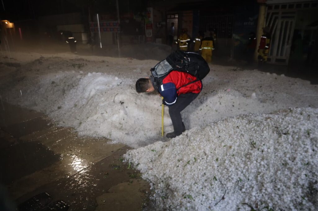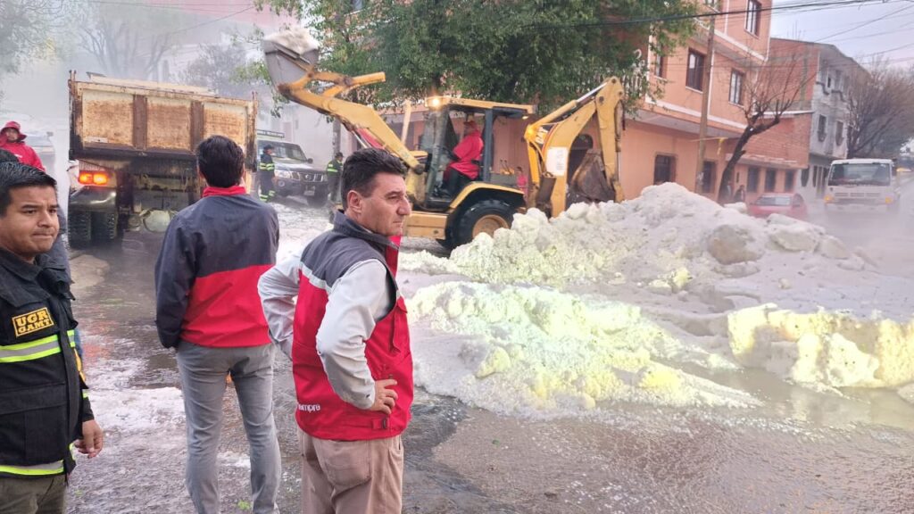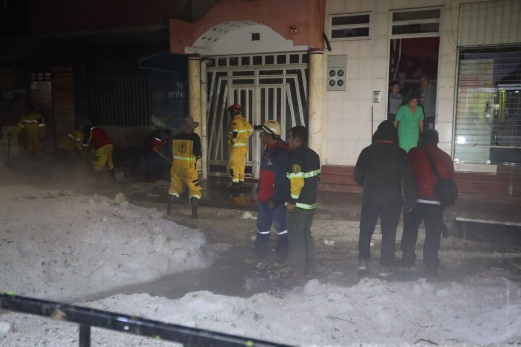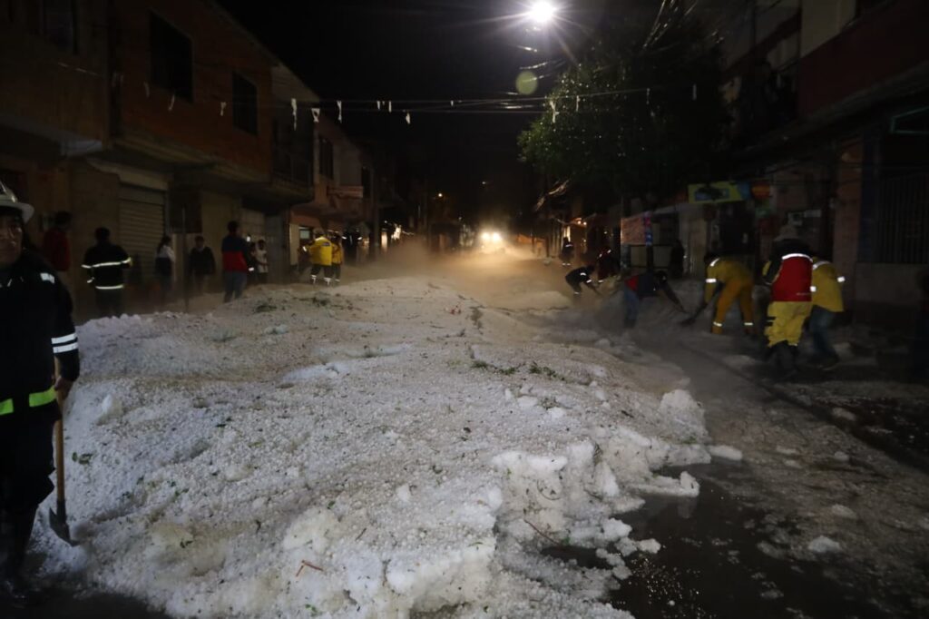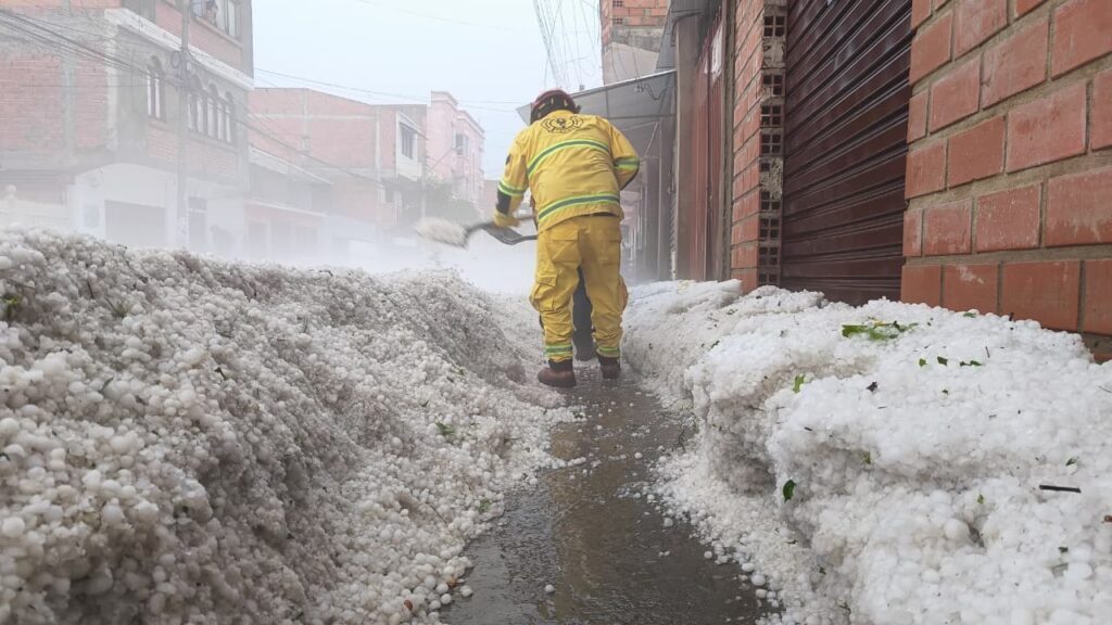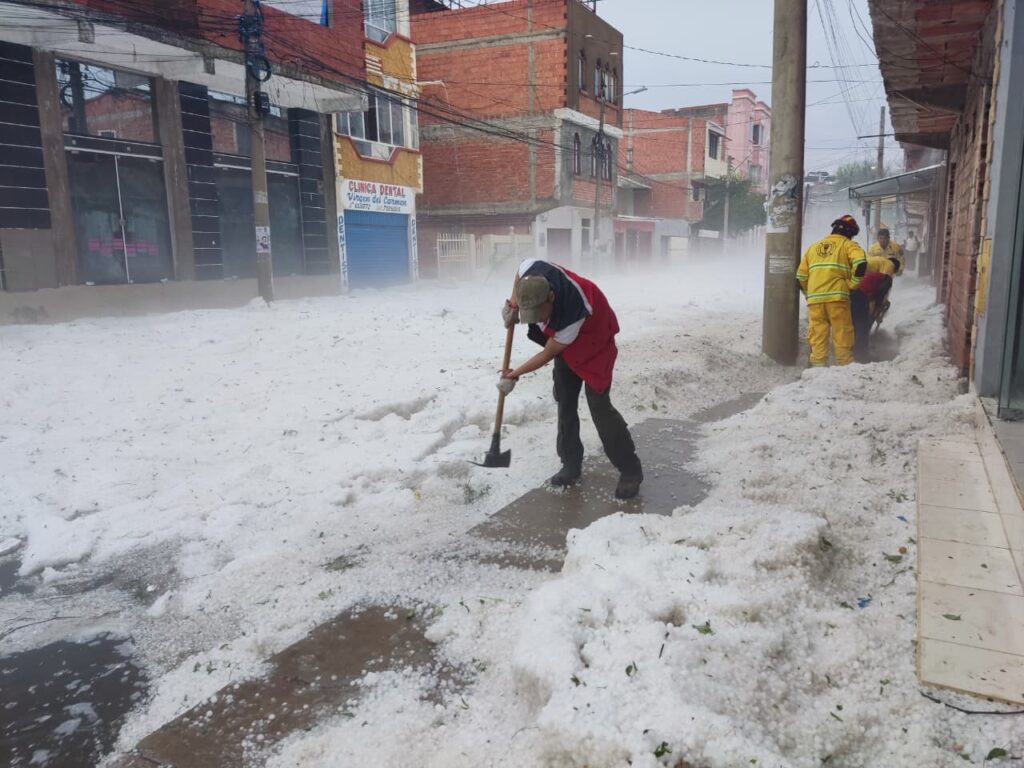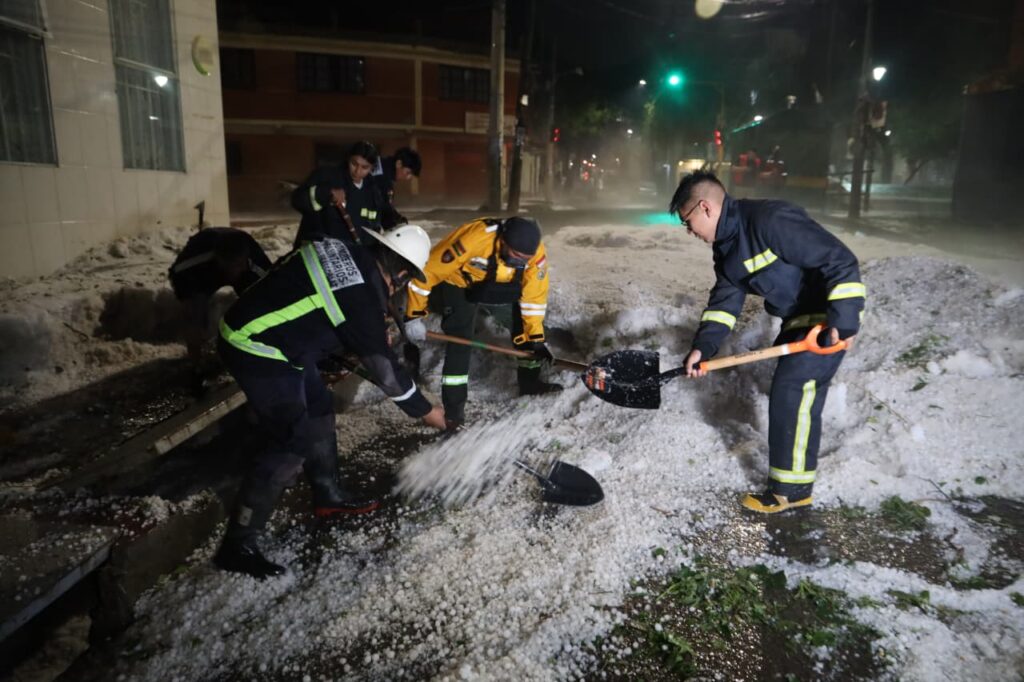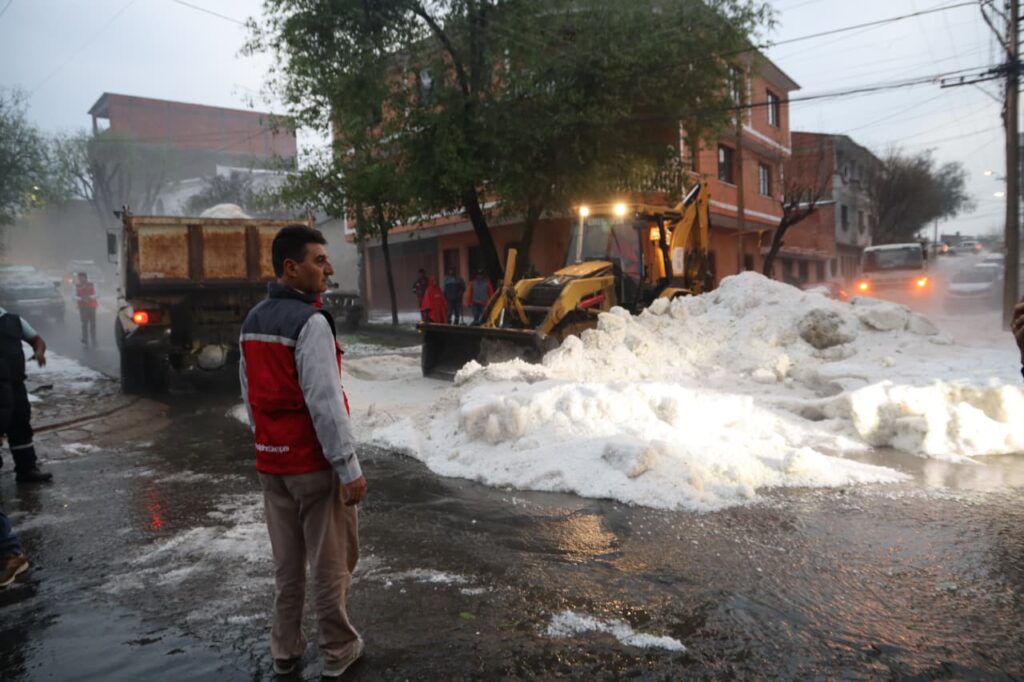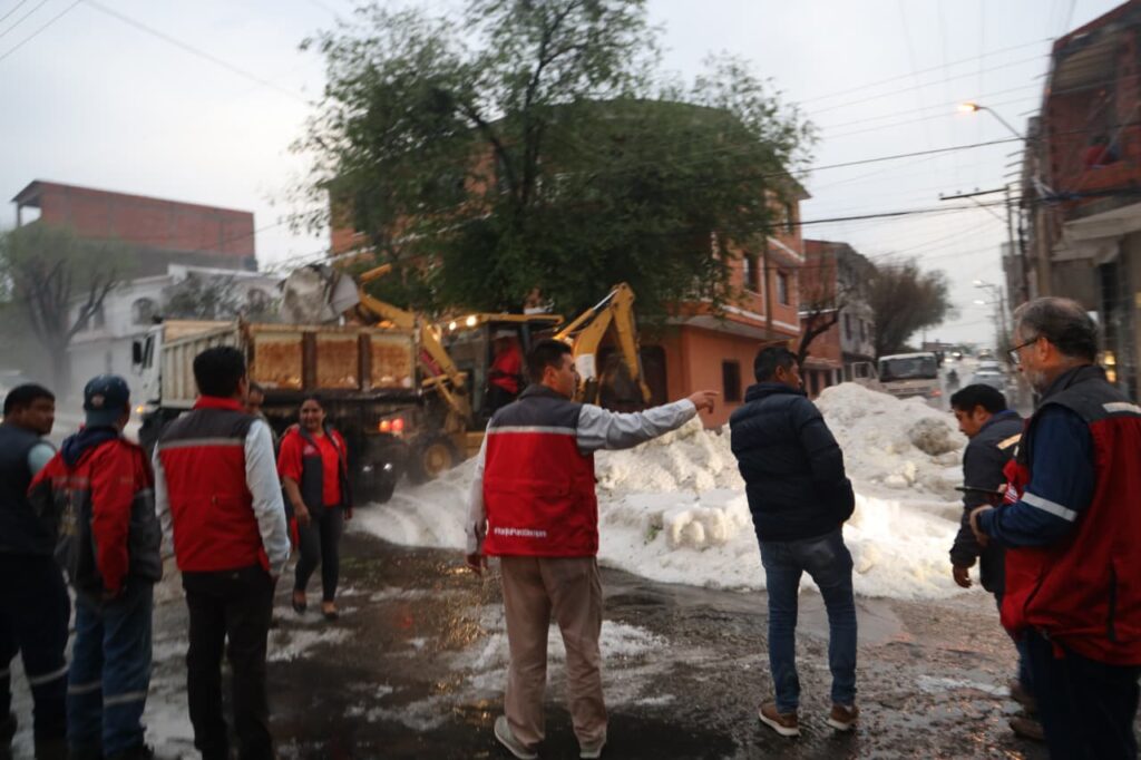 Tras la intensa granizada que cayó en Tarija la tarde del jueves, el alcalde, Johnny Torres Terzo, junto a 200 trabajadores municipales conformaron brigadas de emergencia y llegaron a las zonas más afectadas por el granizo.
