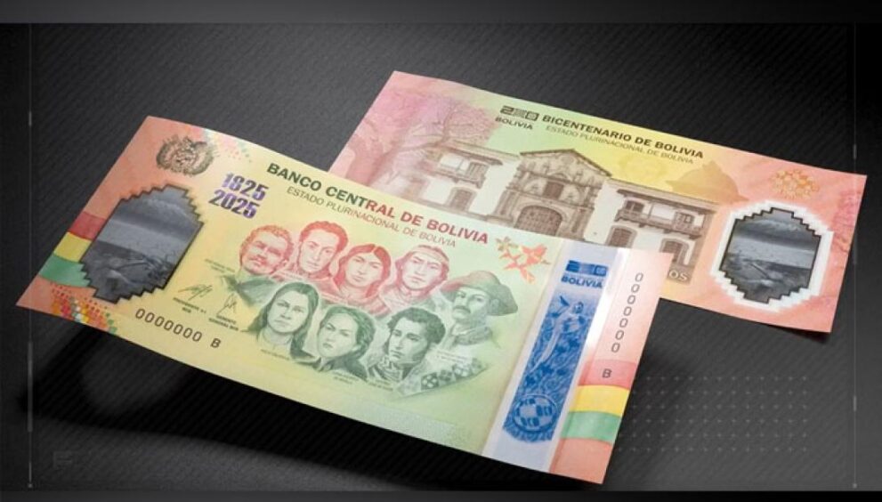 El billete conmemorativo del bicentenario exhibe una ventana transparente donde se aprecian el Illimani, el paisaje del Salar de Uyuni y la imagen del delfín rosado.