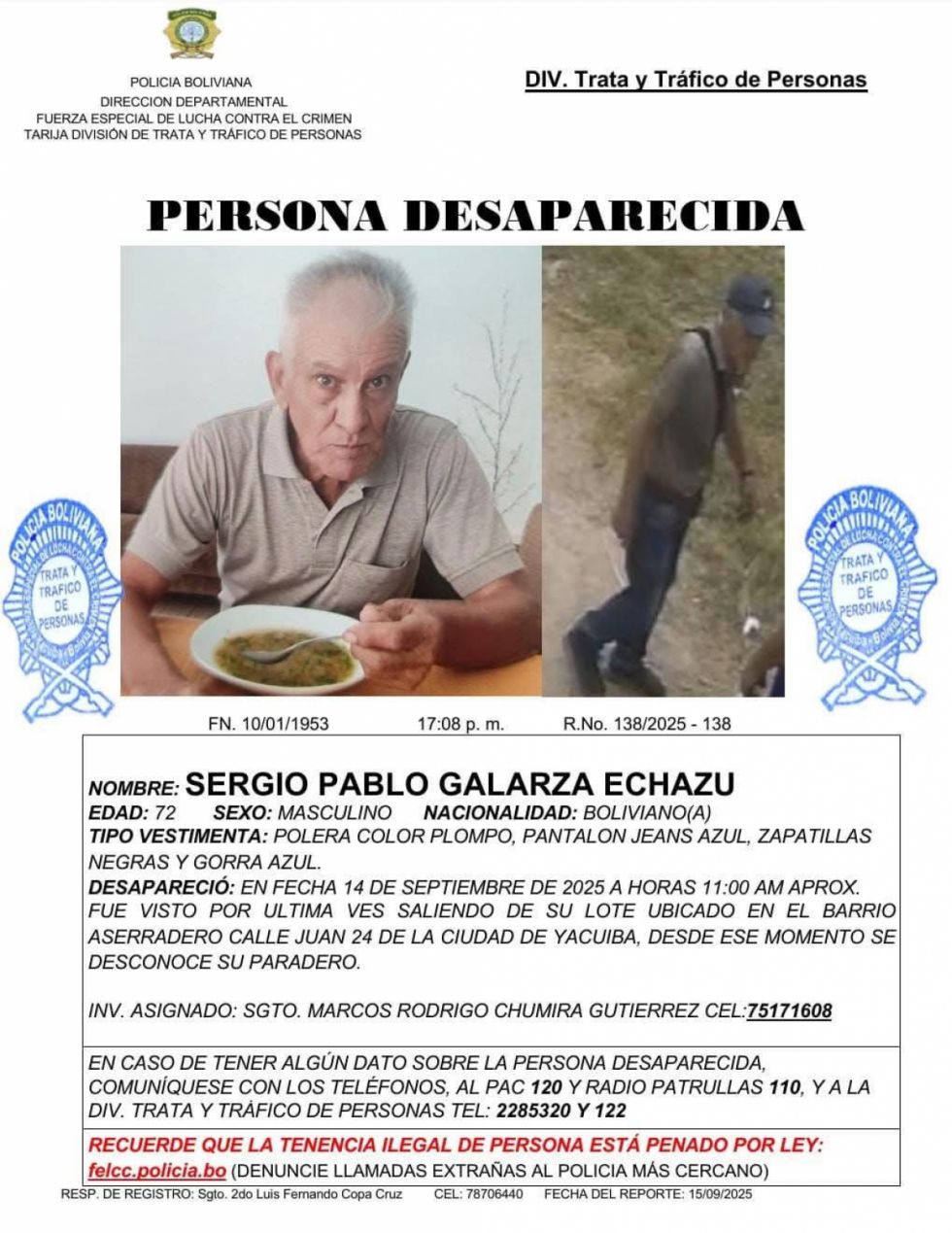 #Nacional Hombre de la tercera edad lleva 10 días desaparecido La Fuerza Especial de Lucha Contra el Crimen (FELCC) de Yacuiba se encuentra tras el rastro de un hombre de plustlt / 4 semanas Comentario (0) (135)