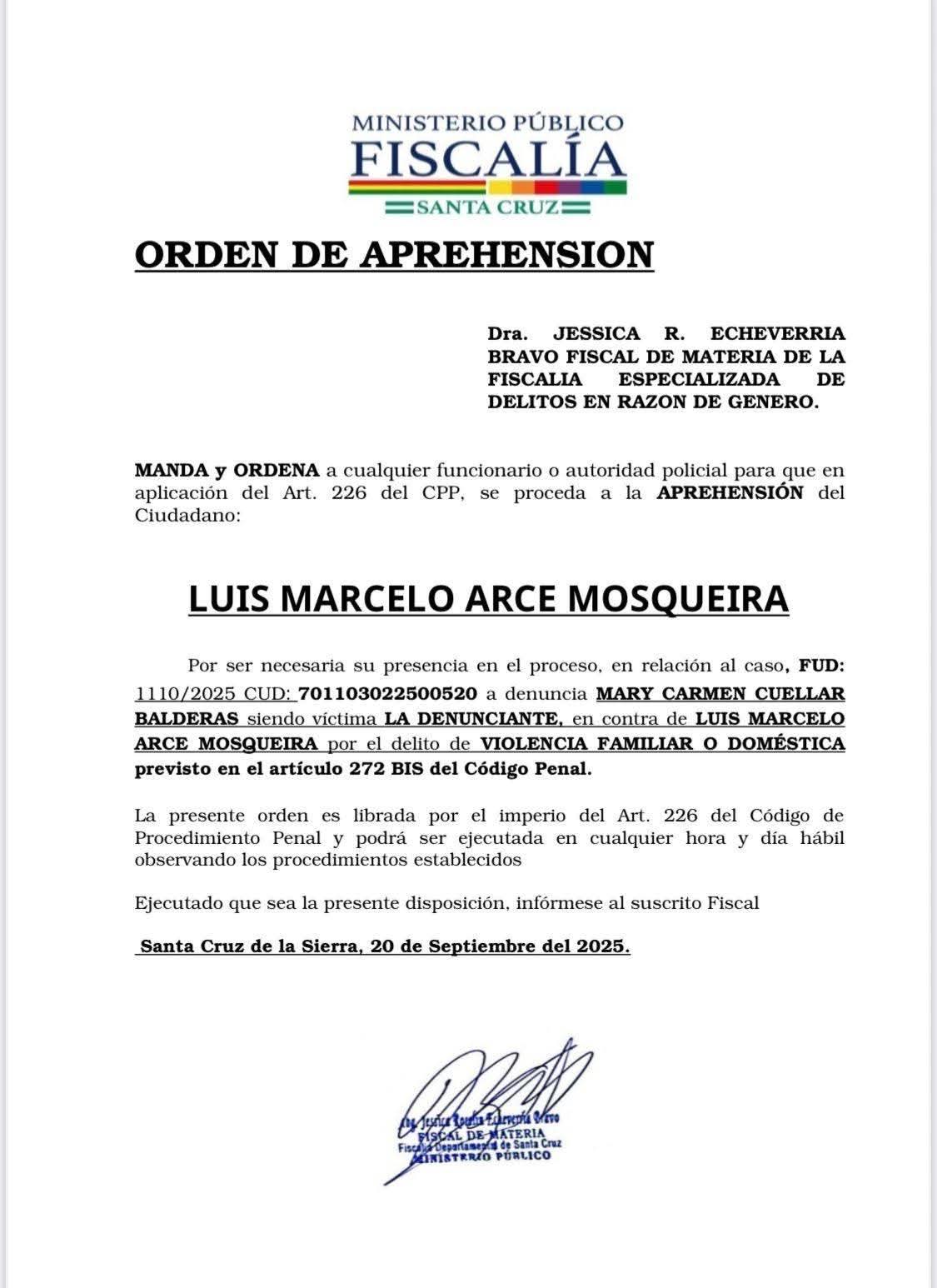 #Nacional Fiscalía emite orden de aprehensión contra hijo del presidente Luis Arce por violencia familiar La Fiscalía Especializada en Delitos en Razón de Género del Ministerio Público emitió una orden de aprehensión contra Luis Marcelo plustlt / 1 mes Comentario (0) (140)