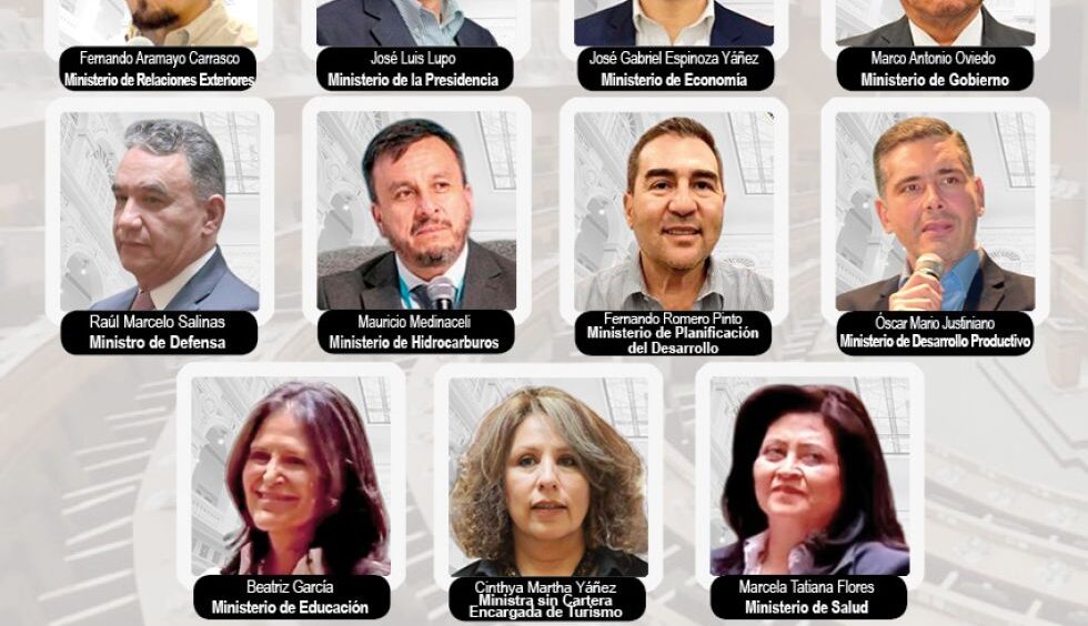 El gabinete lo completan Fernando Aramayo, en Relaciones Exteriores; Raúl Salinas, en Defensa; José Romero, en Planificación del Desarrollo; Mauricio Zamora, en Obras Públicas; Marcela Flores, en Salud y Deportes, y Beatriz García, en Educación. A ellos se suma Cinthya Yáñez Eid, en el nuevo ministerio sin cartera de Turismo y Gastronomía.