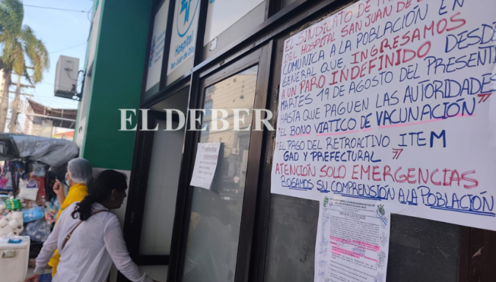 Este martes, los trabajadores de salud de hospitales de hasta tercer nivel de Santa Cruz de la Sierra iniciaron nuevamente un paro indefinido debido al incumplimiento en el pago del viático de vacunación. Además, a su petición se suma el pago de retroactivo ítem GAD y Prefectural.